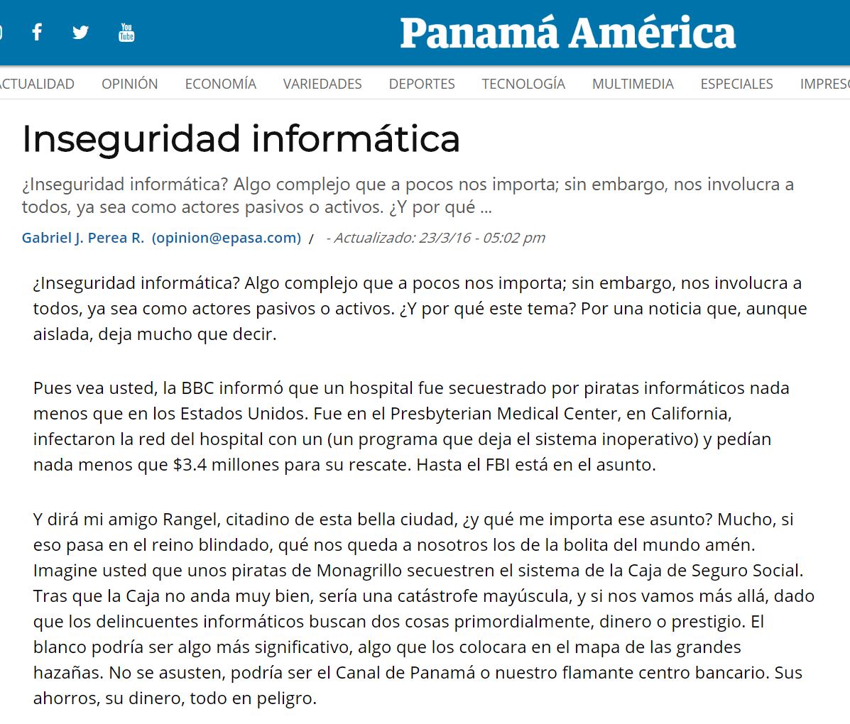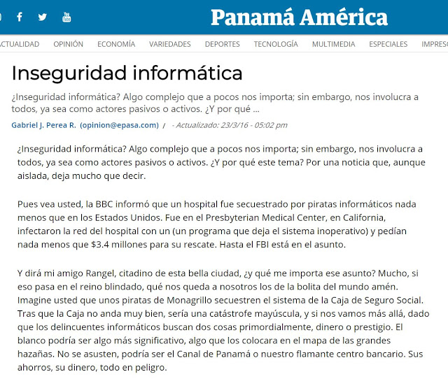 La seguridad informática es un asunto serio, porque una falla de seguridad puede comprometer a las empresas en ocasiones con problemas difíciles de solucionar. Lamentablemente estamos en pañales en Panamá, porque el asunto no se ve como algo serio y no se dedica mucho presupuesto a estos temas. Más se gasta en ocasiones en publicidad que en seguridad. Seguimos pensando que Dios nació en Panamá y que nada puede suceder, dado que no somos un blanco atractivo.
