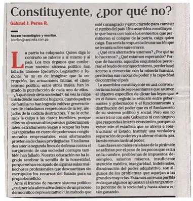 La asamblea constituyente es una convocatoria nacional de representantes que asumen el objetivo específico de dictar las leyes que, en el futuro, regirán la relación entre gobernantes y gobernados y el funcionamiento y distribución del poder que es el fundamento de su sistema político y social. Pero eso no ocurrirá ni con este Gobierno ni con ninguno que responda a interés económico, porque no existe aún el estadista que se atreva a reestructurar el Estado, instituir una verdadera separación de poderes y a alterar el statu quo. Jamás renunciarán al poder.