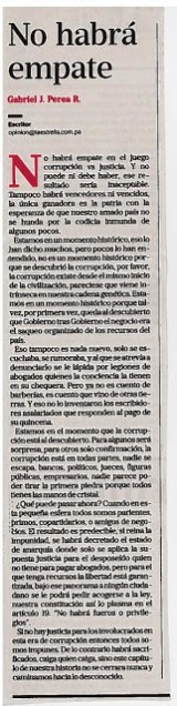 No habrá empate en el juego corrupción vs justicia. Y no puede ni debe haber, ese resultado sería inaceptable. Tampoco habrá vencedores ni vencidos, la única ganadora es la patria con la esperanza de que nuestro amado país no se hunda por la codicia inmunda de algunos pocos.