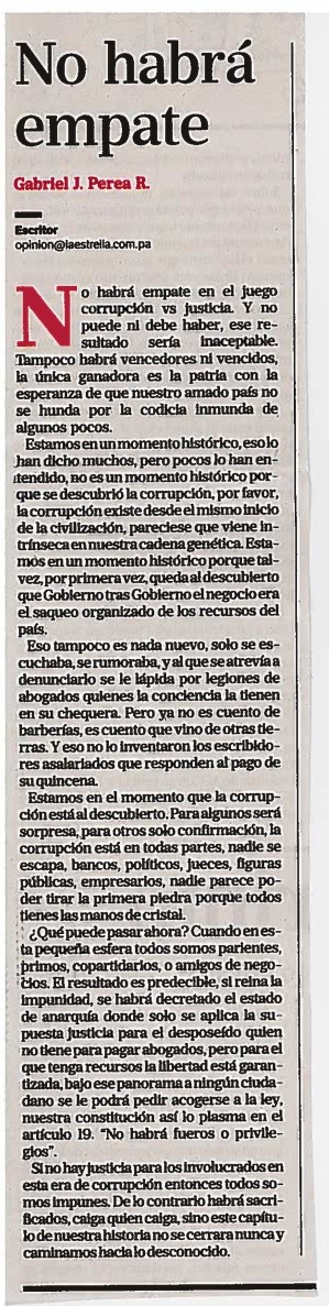 No habrá empate en el juego corrupción vs justicia. Y no puede ni debe haber, ese resultado sería inaceptable. Tampoco habrá vencedores ni vencidos, la única ganadora es la patria con la esperanza de que nuestro amado país no se hunda por la codicia inmunda de algunos pocos.