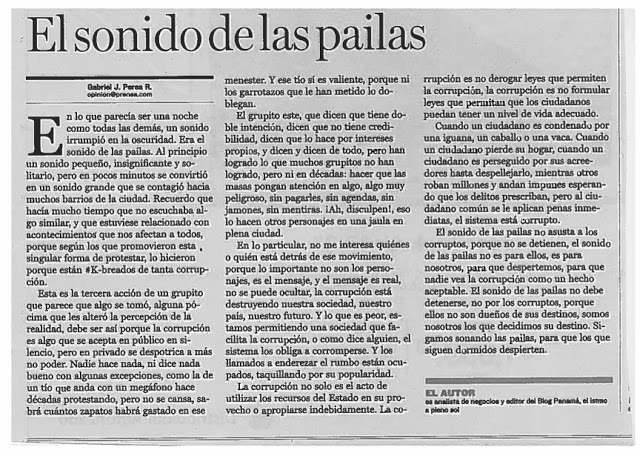 El sonido de las pailas no asusta a los corruptos, porque no se detienen, el sonido de las pailas no es para ellos, es para nosotros, para que despertemos, para que nadie vea la corrupción como un hecho aceptable. El sonido de las pailas no debe detenerse, no por los corruptos, porque ellos no son dueños de sus destinos, somos nosotros los que decidimos su destino. Sigamos sonando las pailas, para que los que siguen dormidos despierten.