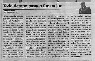 ¿Fue entonces un pasado mejor? Tal vez lo único real de ese pasado mejor es que vivíamos menos agobiados por un entorno en donde ocurrían sucesos y no nos enterábamos al instante y lo que conocíamos era la interpretación de alguien.