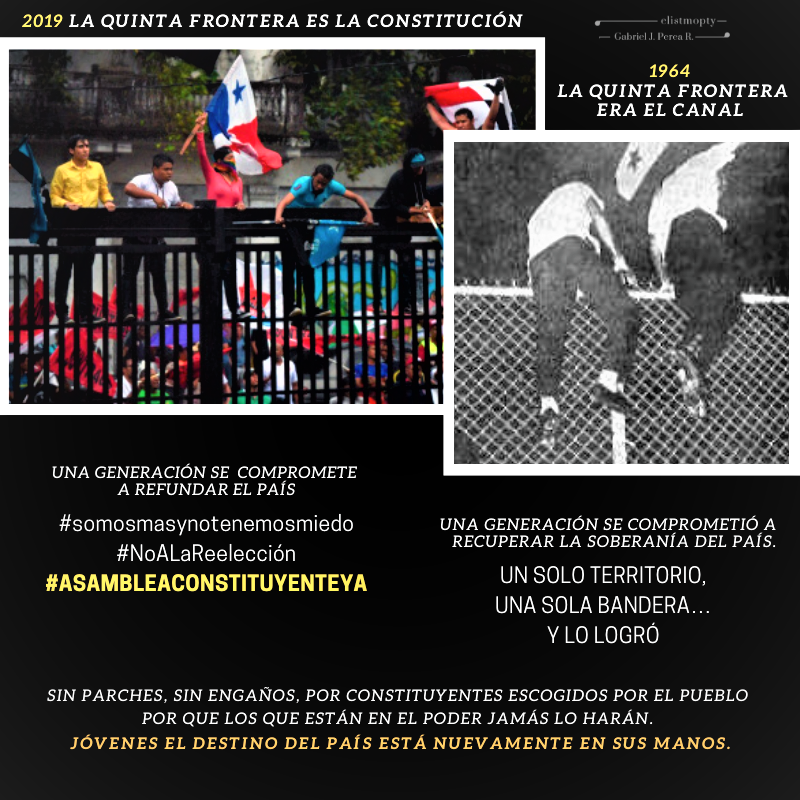 Un solo territorio una sola bandera. Se lanzaron sin titubear y lo lograron. 2019 , un número, un año, un movimiento, juventud, ideas, dolor, impotencia son muchas las cosas que pueden decirse de lo que esta ocurriendo ahora en Panamá. La gesta del 9 de enero de 1964 será inigualable, pero debe servir de inspiración para que una generación de jóvenes enfrente la nueva frontera que en esta ocasión no nos fue impuesta por extranjeros que no hablan nuestro idioma, nos la impusimos nosotros mismos y debe ser derribada.