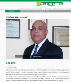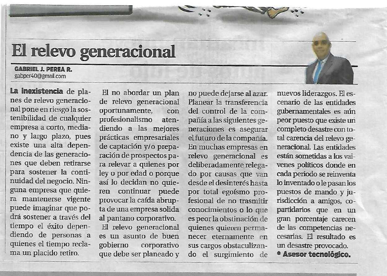 En muchas empresas en relevo generacional es deliberadamente relegado por causas que van desde el desinterés hasta por total egoísmo profesional de no trasmitir conocimientos o lo que es peor la obstinación de quienes quieren permanecer eternamente en sus cargos obstaculizando el surgimiento de nuevos liderazgos. El escenario de las entidades gubernamentales es aún peor puesto que existe un completo desastre con total carencia del relevo generacional. Las entidades están sometidas a los vaivenes políticos donde en cada periodo se reinventa lo inventado o le pasan los puestos de mando y jurisdicción a amigos, copartidarios que en un gran porcentaje carecen de las competencias necesarias. El resultado es un desastre provocado.