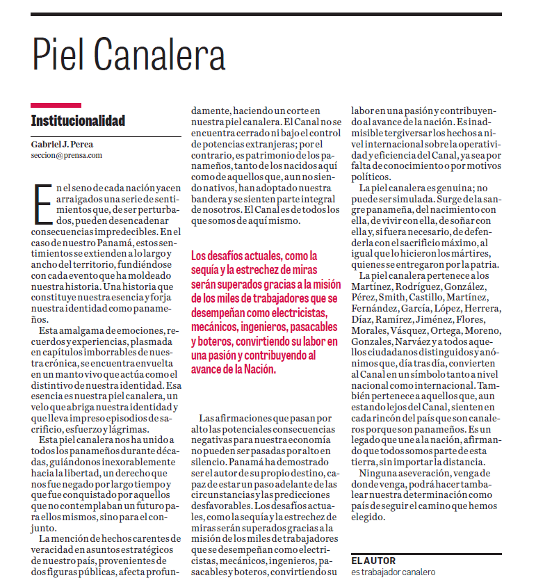 La mención de hechos carentes de veracidad en asuntos estratégicos de nuestro país, provenientes de dos figuras públicas, afecta profundamente, haciendo un corte en nuestra piel canalera. El Canal no se encuentra cerrado ni bajo el control de potencias extranjeras; por el contrario, es patrimonio de los panameños, tanto de los nacidos aquí como de aquellos que, aun no siendo nativos, han adoptado nuestra bandera y se sienten parte integral de nosotros. El Canal es de todos los que somos de aquí mismo.