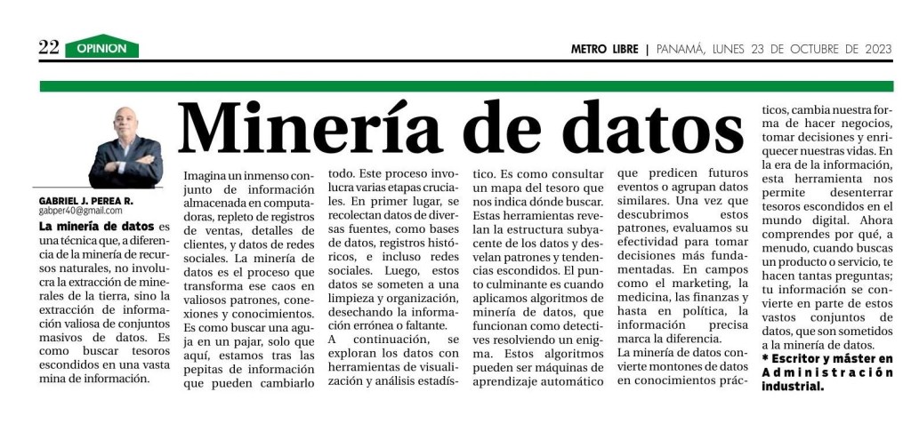 La minería de datos convierte montones de datos en conocimientos prácticos, cambia nuestra forma de hacer negocios, tomar decisiones y enriquecer nuestras vidas. En la era de la información, esta herramienta nos permite desenterrar tesoros escondidos en el mundo digital. Ahora comprendes por qué, a menudo, cuando buscas un producto o servicio, te hacen tantas preguntas; tu información se convierte en parte de estos vastos conjuntos de datos, que son sometidos a la minería de datos.