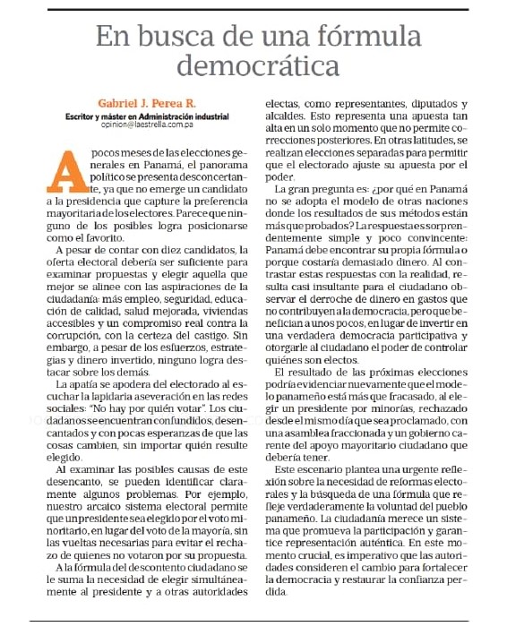 El resultado de las próximas elecciones podría evidenciar nuevamente que el modelo panameño está más que fracasado, al elegir un presidente por minorías, rechazado desde el mismo día que sea proclamado, con una asamblea fraccionada y un gobierno carente del apoyo mayoritario ciudadano que debería tener.