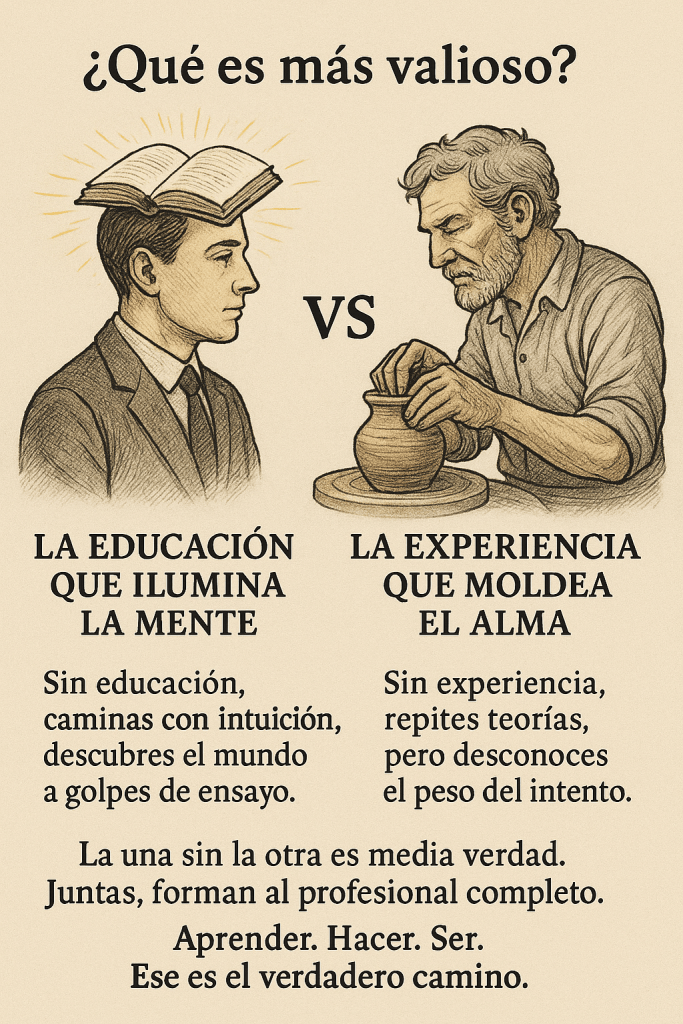 La experiencia, en cambio, nos enseña con cicatrices. Nos muestra la realidad sin filtros, nos obliga a improvisar, a fallar y a aprender desde lo tangible, desde el hacer.