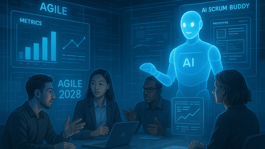 En 2028, equipos ágiles integrarán IA en su trabajo. Un AI Scrum Buddy facilitará sprints, desde planificación hasta revisiones, mejorando la colaboración humano-IA. Esta simbiosis promete agilidad avanzada, enfocándose en visión y creatividad junto a datos y velocidad.